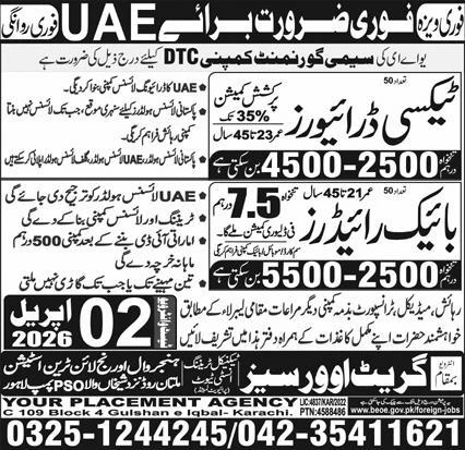 If you’re a Pakistani driver looking for a fresh start abroad with good earning potential and a stable lifestyle, this could be your golden chance. On 1 April 2026, Daily Express newspaper featured an urgent advertisement from Your Placement Agency for multiple taxi driver and bike rider jobs in Abu Dhabi, UAE. These overseas positions are ideal for Matric and Intermediate pass candidates who want to join the booming transportation sector in one of the world’s fastest-growing cities.